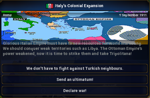 Önerilerim Hindistan'ı Kabilelere bölmen, rusyaya hive hanlığını ekleyip vasalı yapman, bosna devletini ekleyip avusturya vasalı yapmak, (daha sonra gelen eventle annexleyebilecek) Osmanlı'nın libya topraklarını vasal olarak ekleyebilirsin. eğer ki yapmadıysan koreyi japonya vasalı yapabilirsin (daha sonra gelen eventle annexleyebilecek) bir de vittoria emanuel'in fotosunu değiştirmen. onun daha güzel bir portresi var. Event Konusunda veya yurt, teknoloji ve diplomasi konusunda istersen yardımcı olabilirim